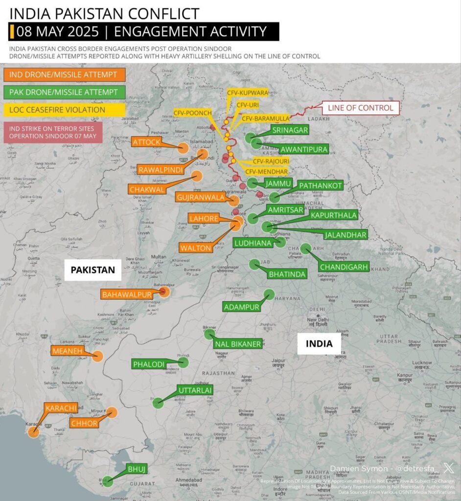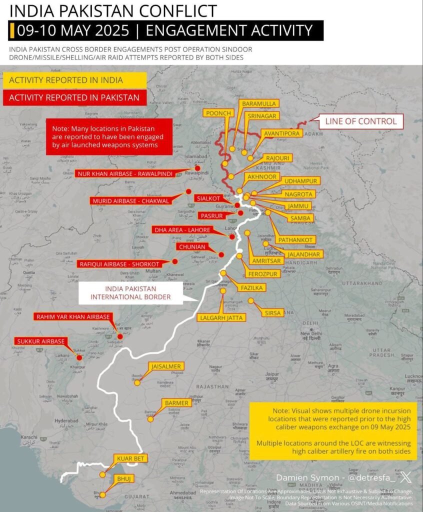 Pakistan expanded operations beyond border areas, conducting coordinated drone and missile attacks against over a dozen Indian military installations in:
