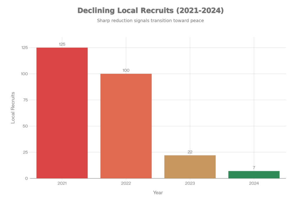 In 2021, 125 local youths were recruited into militant ranks. By the end of 2024, that number had plummeted to just 7. This represents a 94% decline in local recruitment. The “Janaza” (funeral) processions that once served as emotional recruitment rallies have vanished, replaced by quiet burials and a public refusal to let death define their streets.